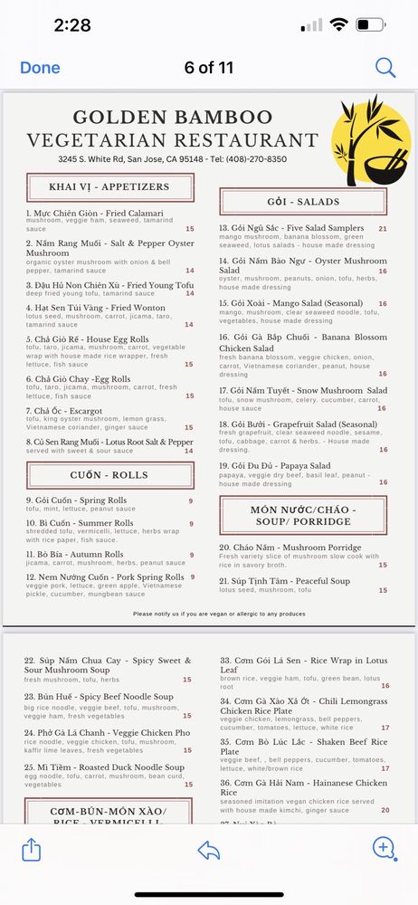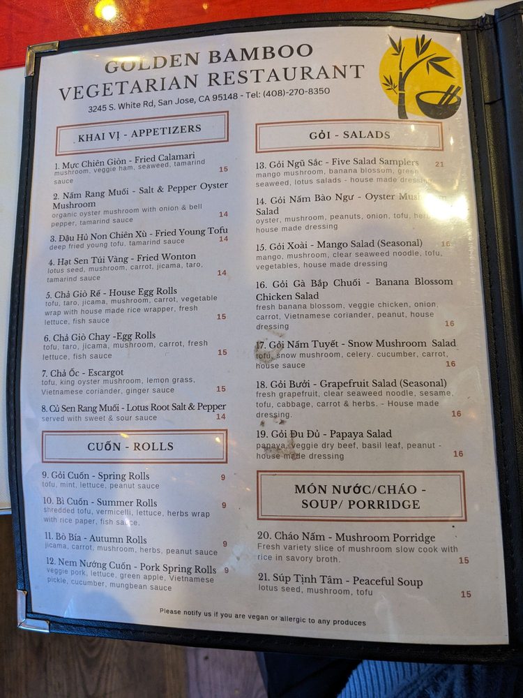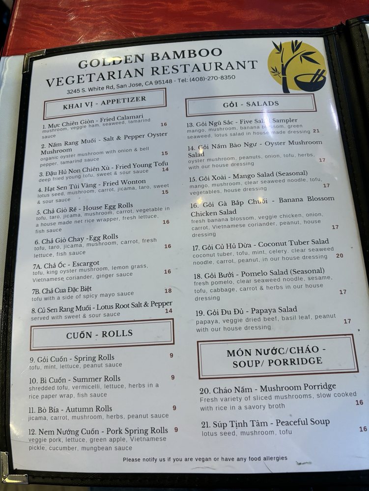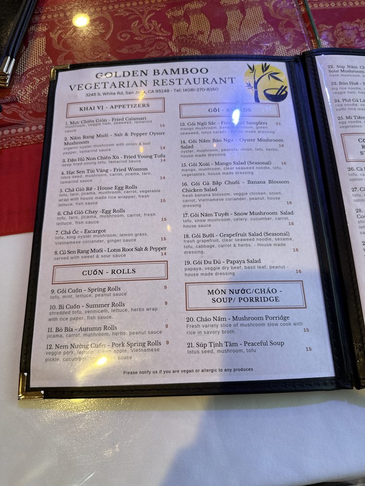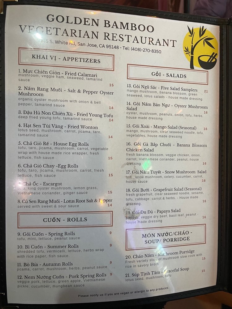 Golden Bamboo Vegetarian, located in San Jose, offers a tranquil and colorful dining experience with a variety of vegetarian and vegan options. This restaurant provides a serene ambiance, friendly service, and stellar vegetarian dishes that impress even non-vegetarians. Customers rave about the delicious house egg rolls, five salad sampler, and mango sticky rice. The decor is cozy and comfy, reflecting Vietnamese and Thai influences. With options for catering, good for groups, and a gender-neutral restroom, Golden Bamboo Vegetarian caters to a diverse crowd. The outdoor seating and Wi-Fi add to the overall dining experience. While prices may be on the higher side, the quality and presentation of the dishes make it worth the visit. Overall, Golden Bamboo Vegetarian is a must-visit for those looking for flavorful vegetarian and vegan Vietnamese cuisine.